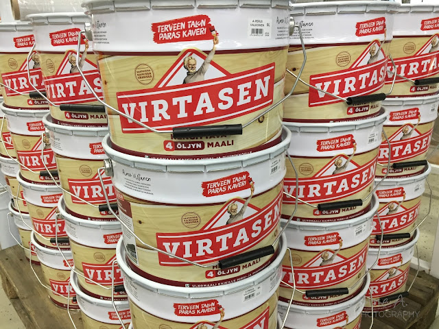 Ensimmäinen maalipurkki meni räystäisiin ja talon yläosan maalauksiin, joten on käyty hommaamassa lisää purkkeja. Ei nyt noin montaa sentään mitä kuvassa on, Jyväskylän Seppälän K-Raudasta on tuo kuva. Varsin riittoisalta tämä maali kyllä vaikuttaa! Ensimmäinen käsittelykerta tosiaan maalataan laimennettuna, jotta maali imeytyy syvemmälle hirteen. Niinpä maalin joukkoon sekoitetaan 1:10 osaa pellavaöljyvernissaa. Maalaamme tätä ensimmäistä kerrosta nyt alhaalta ylöspäin, kun kovin suurta innostusta tikapuille ei niinkään meillä maalaustalkoiden naisväellä ole. :) Eipä maali kyllä juuri valu, ettei roiskeita ole tullut. Mutta viimeisen kerroksen maalaamme sitten ylhäältä alaspäin.